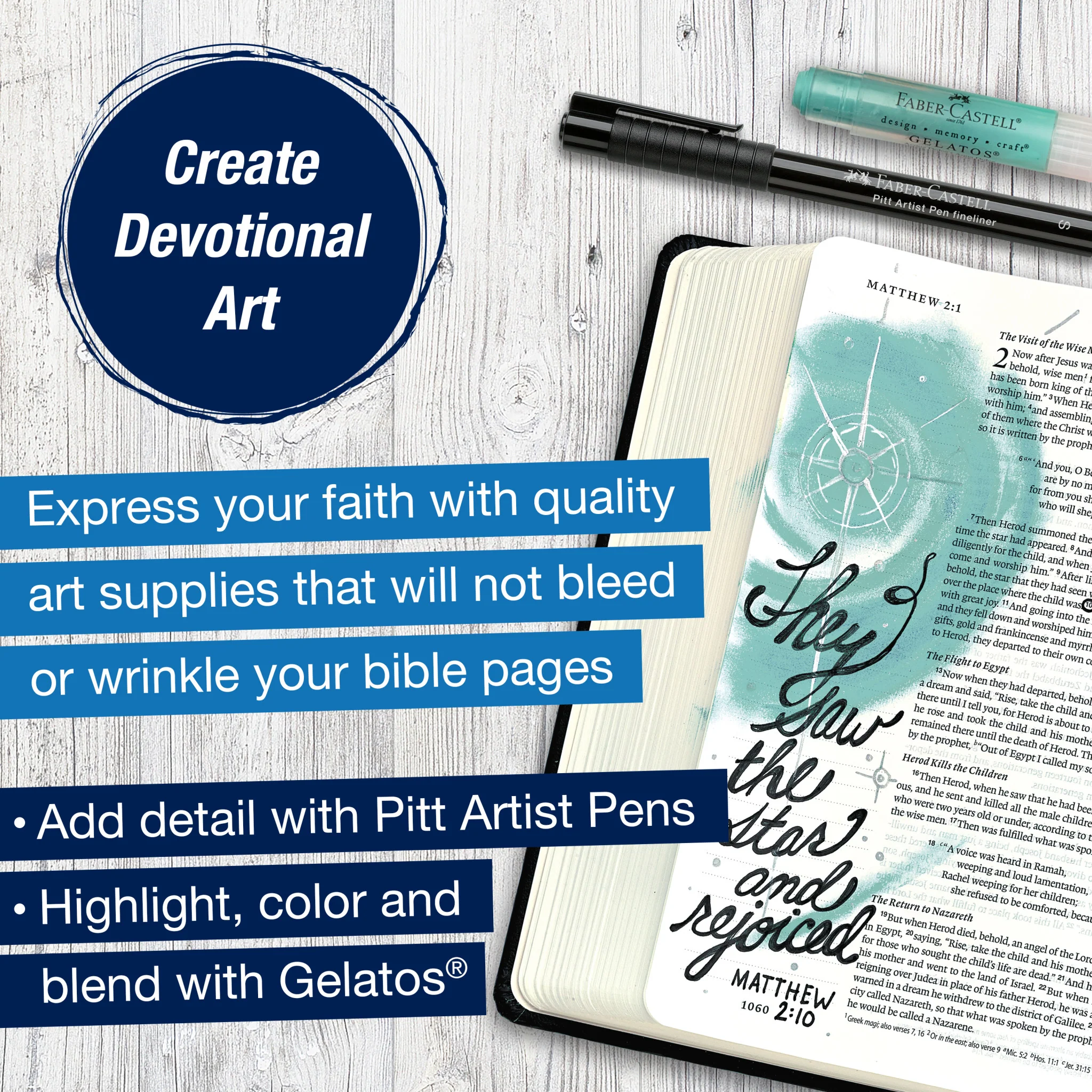 Contents Include: Includes 16 Die Cuts, 2 Sheets Mache Paper, 46 Page Illustrated Design Guide, 16 Stickers, 2 Gelatos Highlighters Colors, 2 Gelatos Colors, 2 Pitt Artist Pens, 2 Mixed Media Stencils and 4 Bible Journaling Stencils.