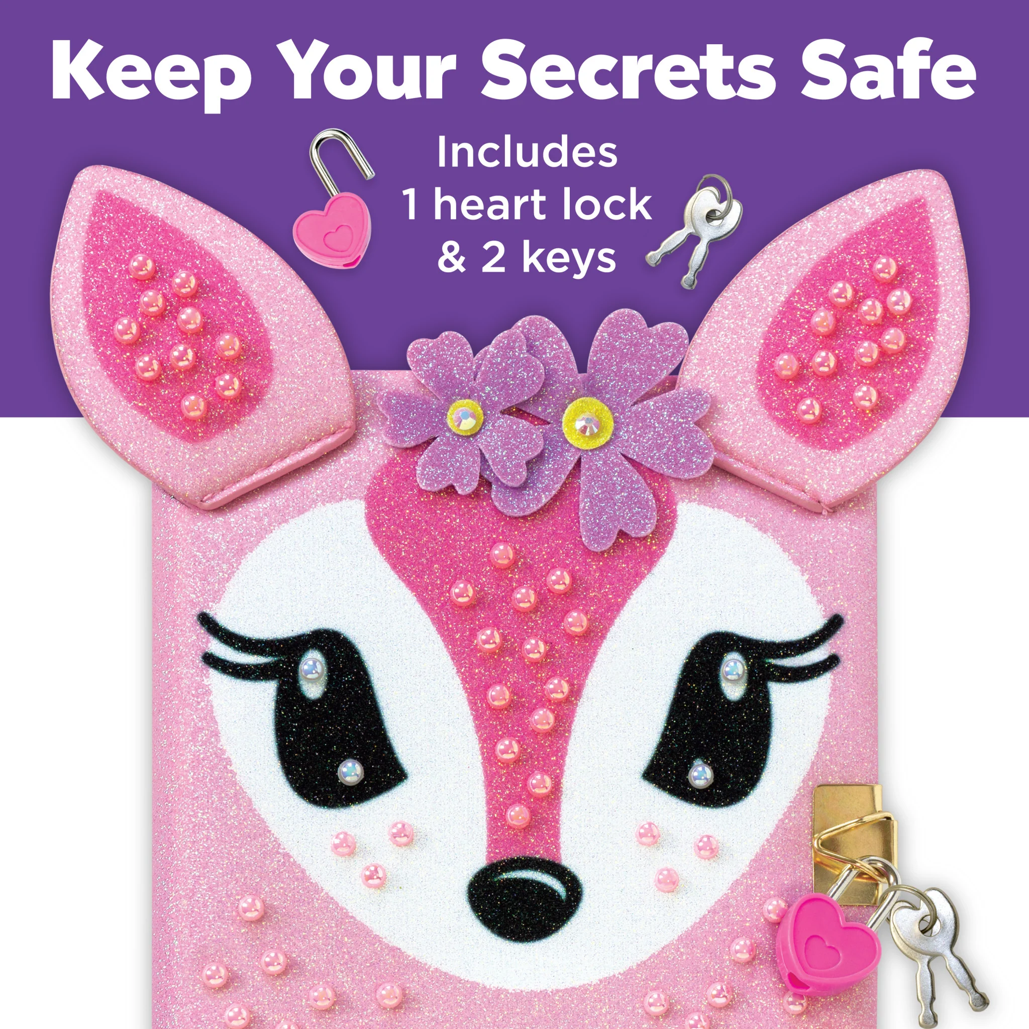Contents Include: 100 Page locking diary, 1 Heart-shaped lock, 2 Heart-shaped keys, 5 Neon markers, 1 Glittery pom-pom pen, 80 Glitter stickers, 100+ Assorted pearls, 1 Craft glue tube and Instructions