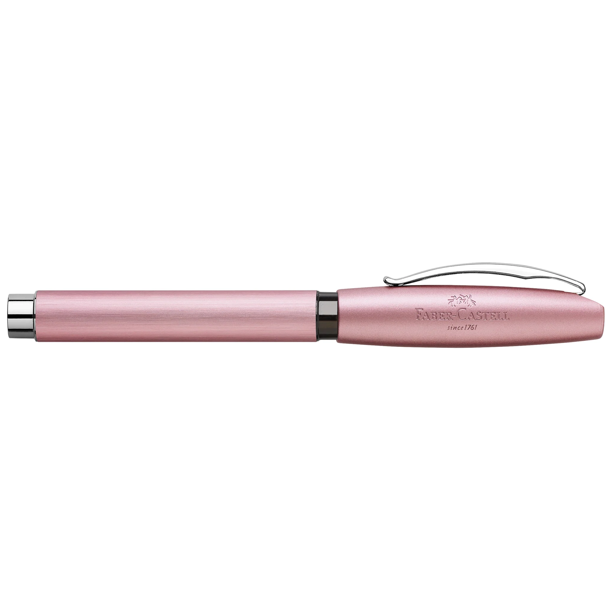 This Essentio Aluminum Rosé Fountain Pen is beautiful to look at, comfortable to hold and a pleasure to write with. Barrel and ergonomic grip zone made of anodized aluminum. Chrome-plated metal clip on the cap is spring-loaded. Cap pulls off and posts on the back end while writing.