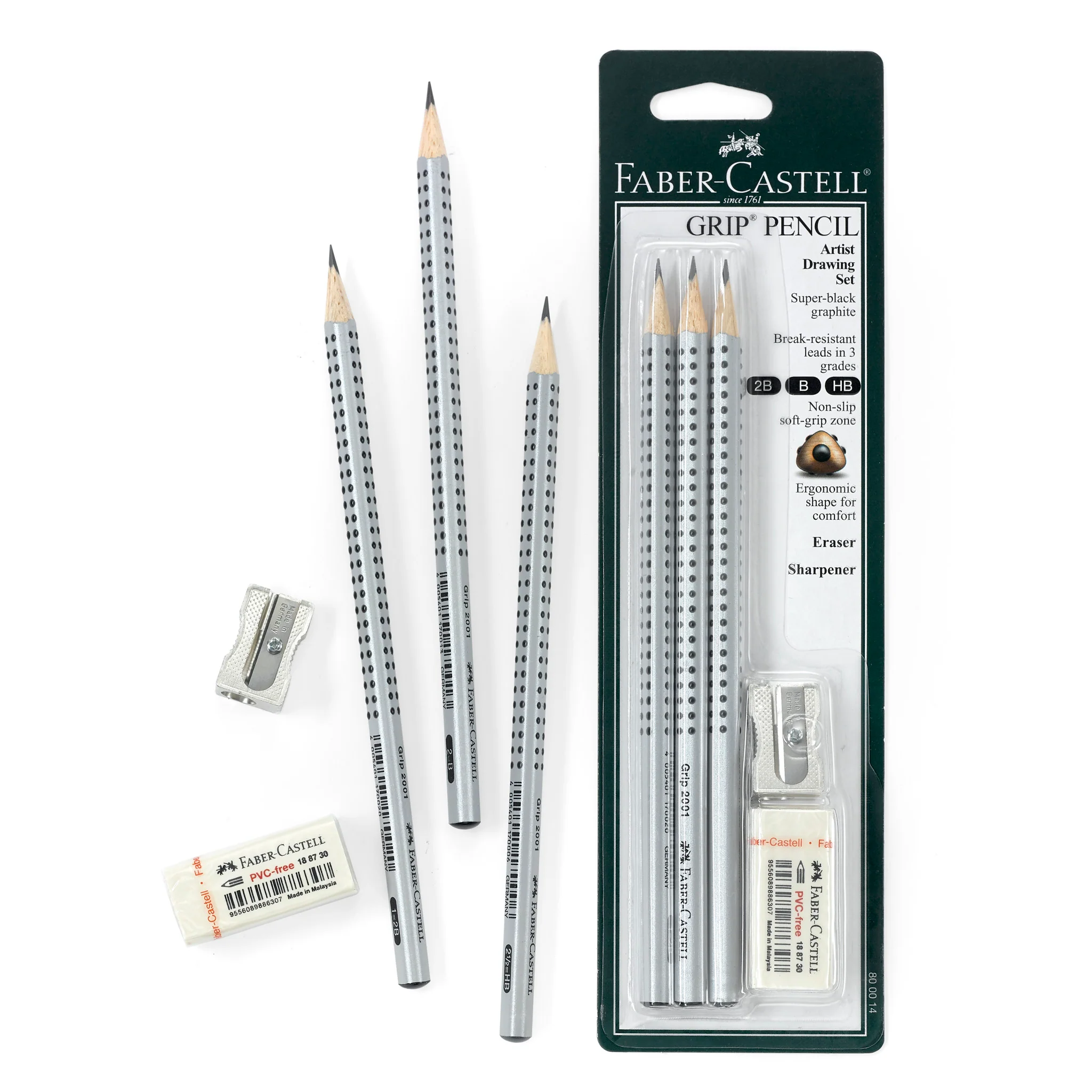 Contents Include: 3 Pencils 2B, B and HB, 1 Metal Sharpener and 1 Dust, PVC and Latex-free Eraser in blister card packaging
