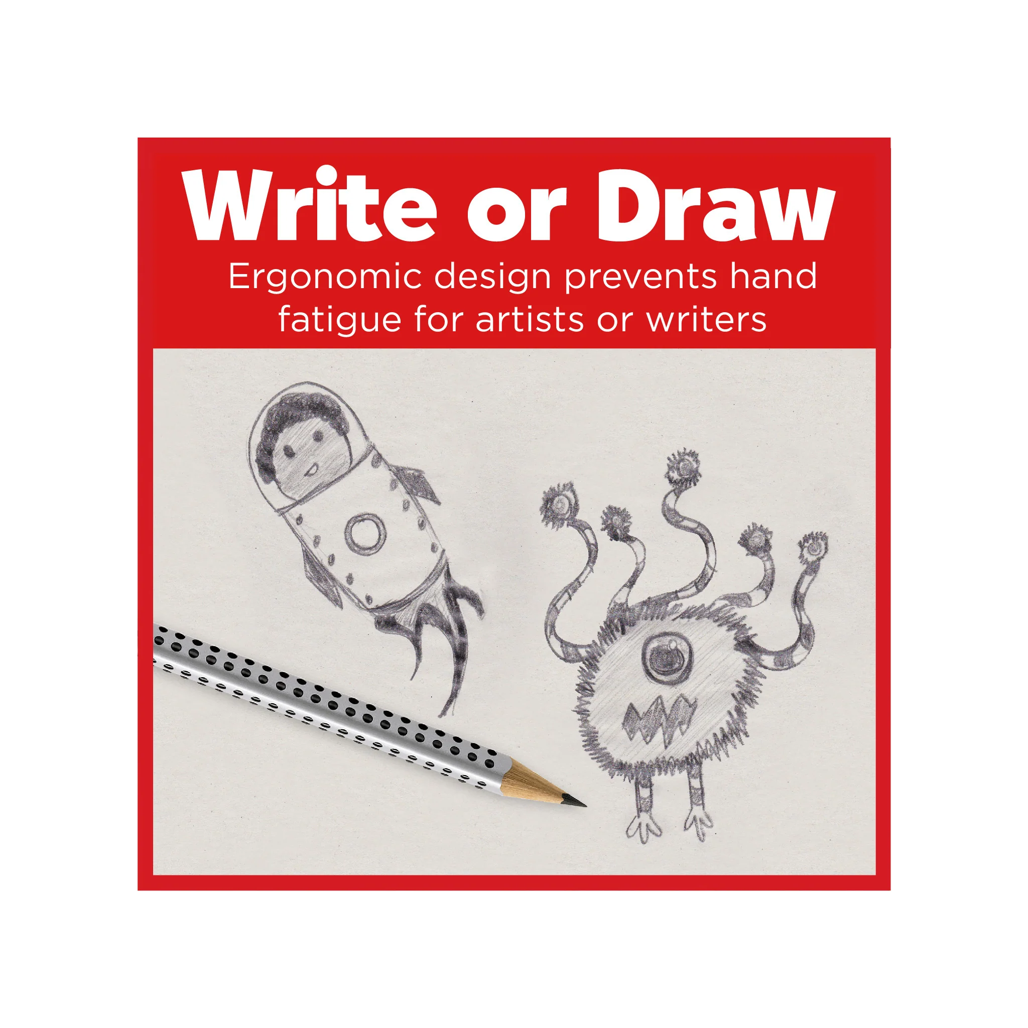 Preferred by Occupational Therapists, the 12mm jumbo triangular shaped pencils have a unique soft-grip zone for a secure hold. The ergonomic, triangular shape helps children hold the pencil correctly and provides comfort and ease for tireless writing or drawing. Lead hardness is degree B = 2. Leads are break-resistant and will not fall out while sharpening. The perfect first writing pencil for children!