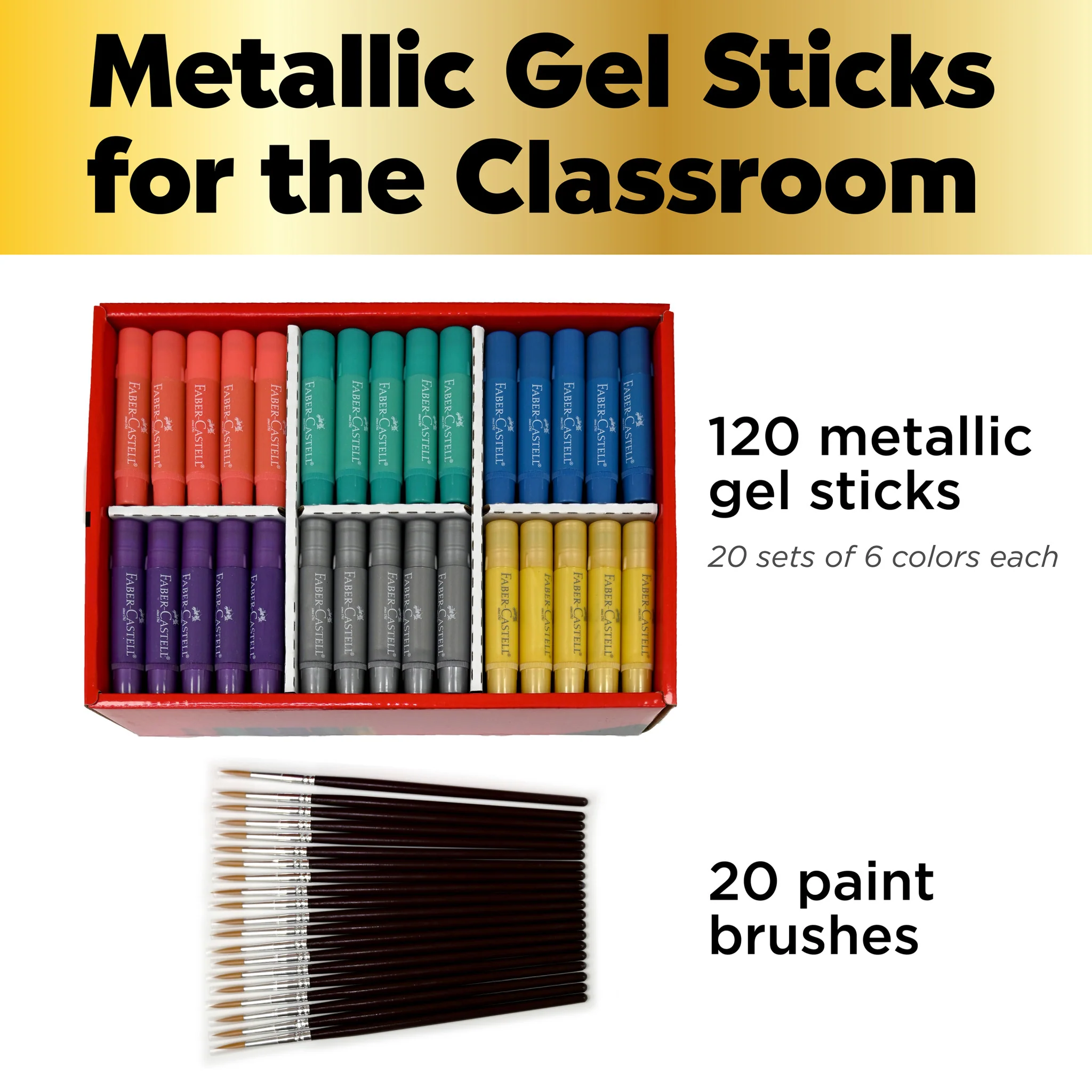 Contents Include: 120 Gel Sticks - 20 sets of 6 colors: Gold, Silver, Blue, Pink, Purple and Green and 20 paintbrushes
