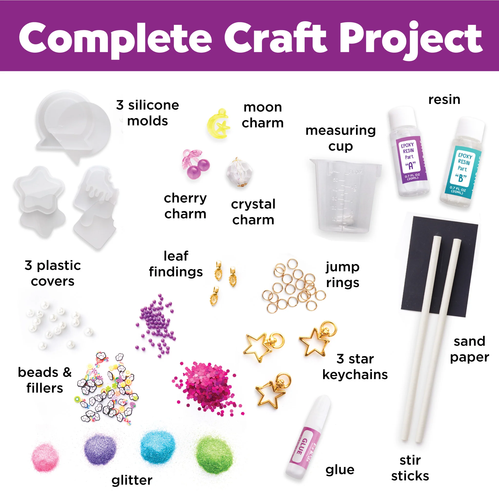 Contents Include: 2 part resin A and B 0.7 fl oz. (20ml) each, 3 silicone molds, 3 plastic covers, 4 colors of glitter, glue 0.2 fl oz. (6 ml), beads & fillers, cherry charm, moon charm, crystal charm, 3 star shaped keychains, measuring cup, stir sticks, jump rings, leaf findings, sand paper, instructions