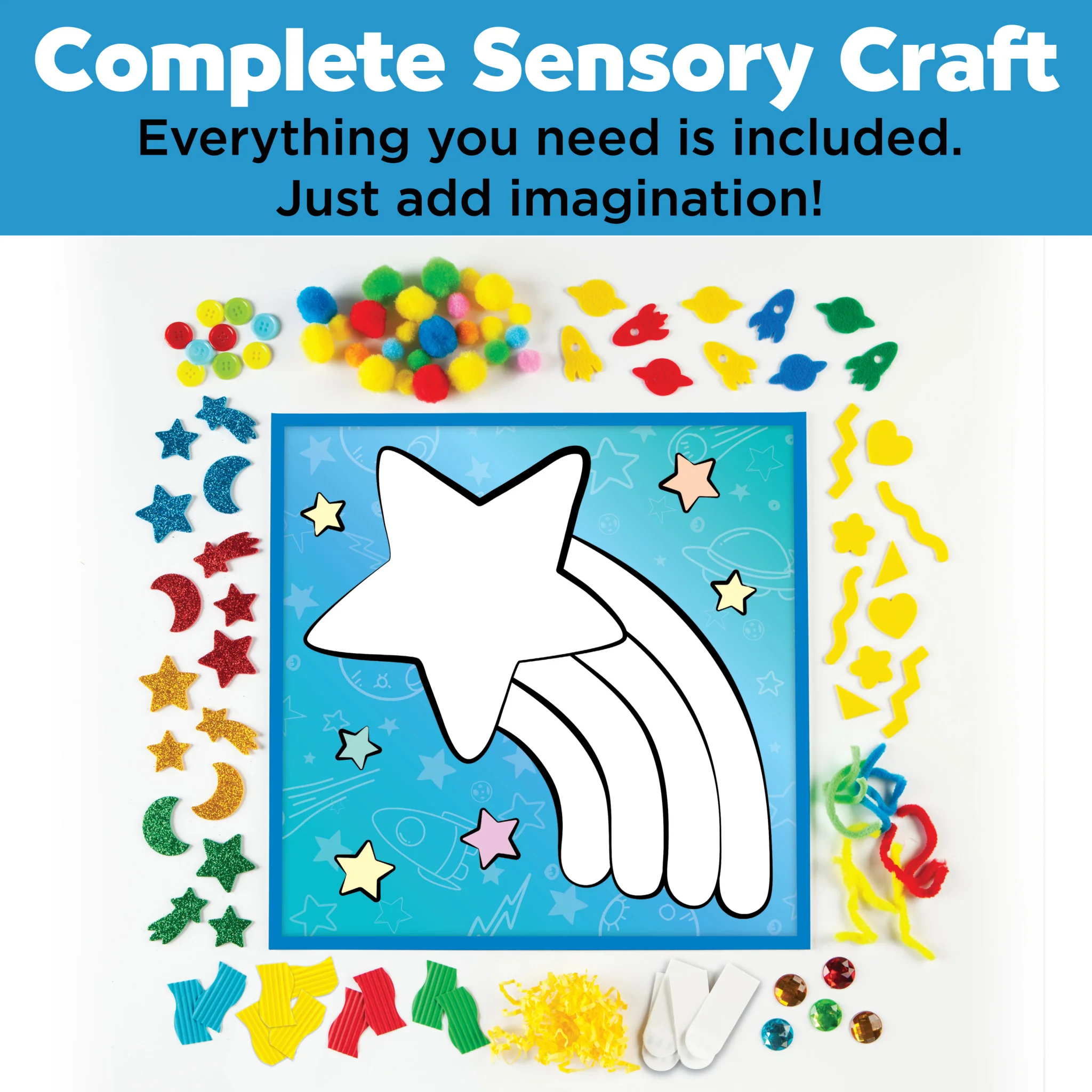 Contents Include: 1 Self-adhesive star poster, 4 Hanging strips, Assorted pom poms, Assorted foam shapes, Assorted glitter paper shapes, Assorted chenille floss, Rhinestones, Assorted wavy paper shapes, Assorted felt shapes, Buttons and Instructions